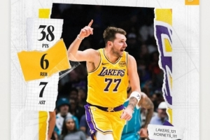 本场比赛,东契奇出战38分钟,28中14,三分15中5,罚球5中5砍下38分6篮板7助攻1抢断。