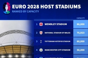 2028年欧洲杯球场容量排名:温布利8.6万人居首,热刺球场6万人
