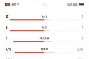 体育资讯11月16日讯 葡萄牙半场5-1领先亚美尼亚,上半场比赛葡萄牙狂射17脚,8射正打入5球!
